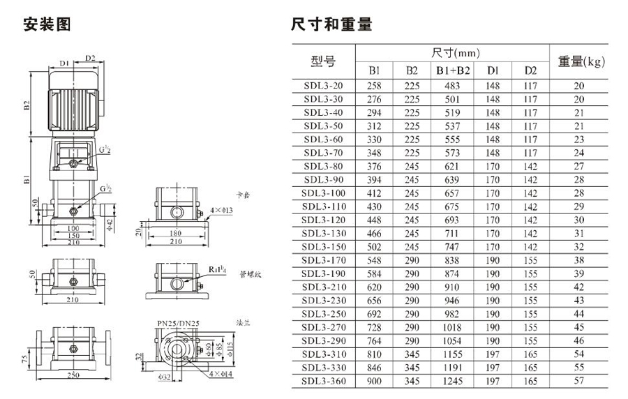 SDL3/SDLT3為配用標準電機的非自吸立式多級離心泵,電機軸和泵軸用聯軸器直接聯接,把拉桿用螺母將外筒,過流部件固定在支架和進出水體之間,泵進出水口在泵底部的同一直線上。泵可根據需要配置智能保護器,對泵的干轉、缺相、過載等進行有效的保護。