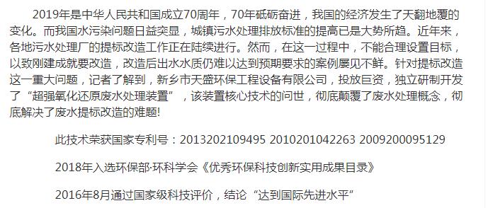 中國高新技術網發布:《關注:解碼科技創新》——新鄉市天盛環保“超強氧化還原廢水處理技術”